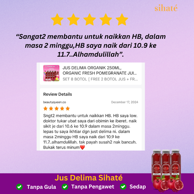 Kami pun rasa TAK LAYAK untuk terima BAYARAN jika Jus Delima Sihaté ini TAK MEMBANTU meningkatkan HB anda